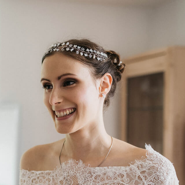 Getragen werden kann das Schmuckstück in einer Hochsteckfrisur, halb-offenen Brautfrisur und sogar mit offenen Haaren. Platziere dazu das Haarband einfach vorne im Haar und befestige es mit den mitgelieferten Satinband und/oder Haarnadeln. Wenn du möchtest, kann dazu auch sehr hübsch ein Schleier kombiniert werden.